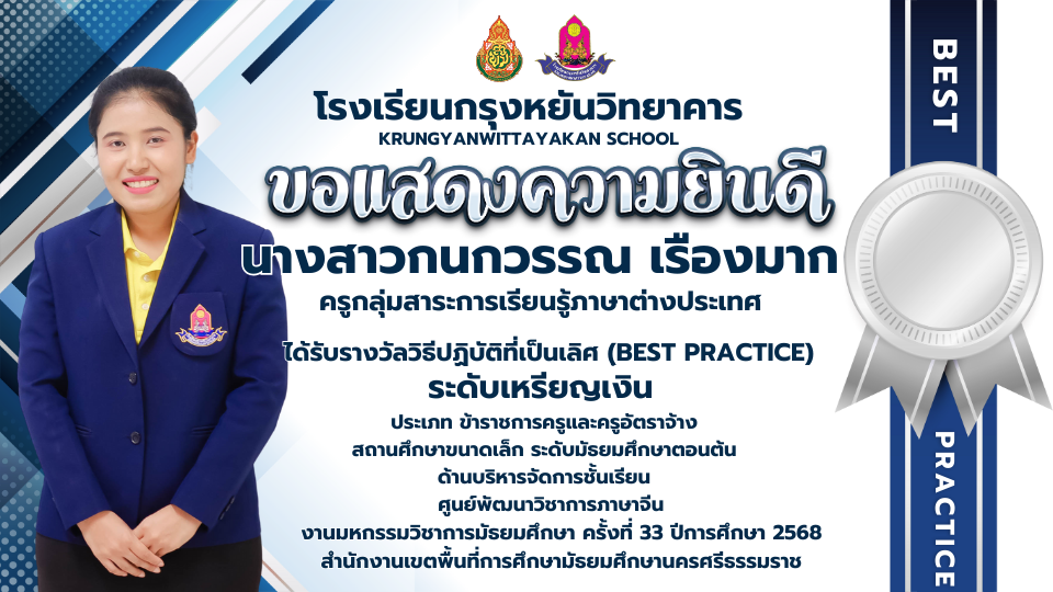 ครูกลุ่มสาระการเรียนรู้ภาษาต่างประเทศ ได้รับรางวัลวิธีปฏิบัติที่เป็นเลิศ (BEST PRACTICE) ระดับเหรียญเงิน ประเภท ข้าราชการครูและครูอัตราจ้าง